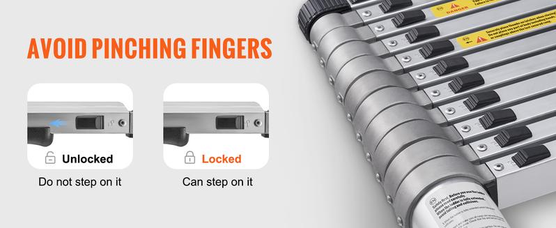 - Independent Locking: The ladder can be adjusted in length through the independent locking keys on each step. The independent locking design ensures better safety during frequent climbing operations. When retracting the ladder, simply use both thumbs to release the lock buttons for a slow and smooth descent, avoiding any risk of pinching your fingers, making the operation safe and simple.